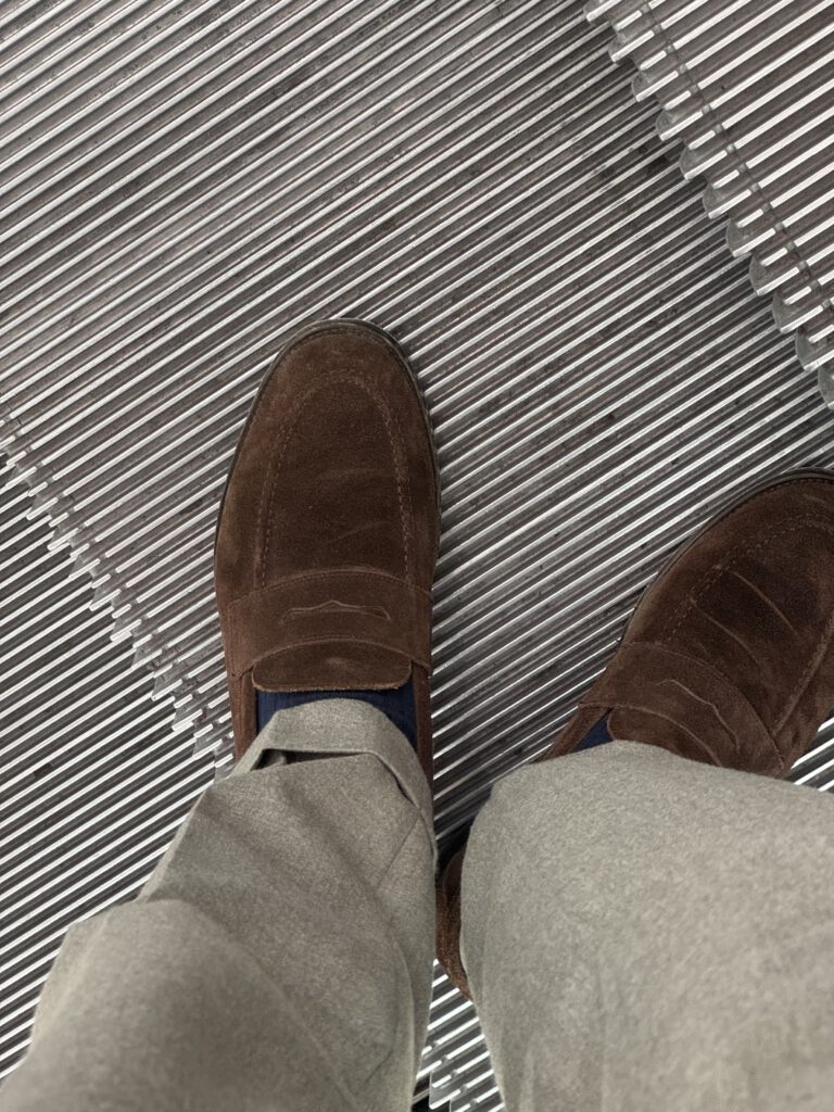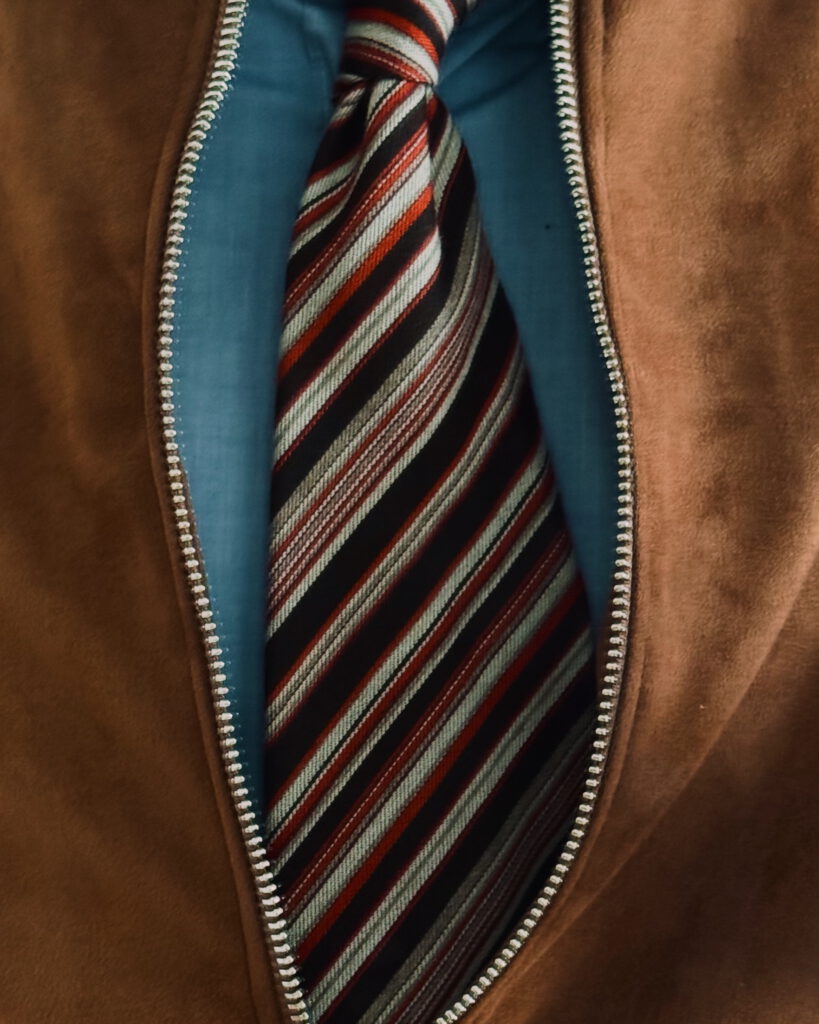 🐿️ Rust suede, soft and matte. A chambray that catches the light. Inside, a wool tie with diagonal stripes in black, grey, rust, and cream.